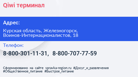 Qiwi, терминал по адресу Курская область, Железногорск, Воинов-Интернационалистов, 18 в дальнейшем Организация, размещена в следующих категориях: