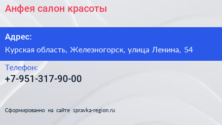 Анфея, салон красоты по адресу Курская область, Железногорск, улица Ленина, 54 в дальнейшем Организация, размещена в следующих категориях: