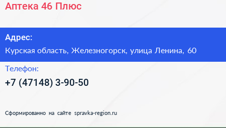 Аптека 46 Плюс по адресу Курская область, Железногорск, улица Ленина, 60 в дальнейшем Организация, размещена в следующих категориях: