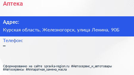 Аптека по адресу Курская область, Железногорск, улица Ленина, 90Б в дальнейшем Организация, размещена в следующих категориях: