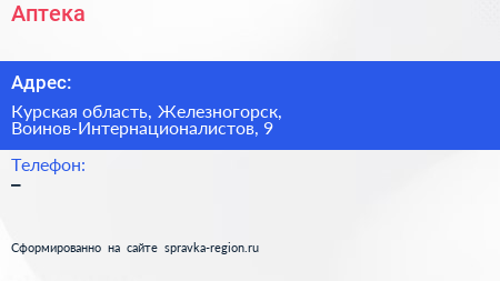 Аптека по адресу Курская область, Железногорск, Воинов-Интернационалистов, 9 в дальнейшем Организация, размещена в следующих категориях: