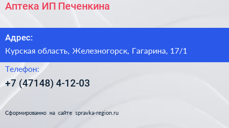 Аптека, ИП Печенкина по адресу Курская область, Железногорск, Гагарина, 17/1 в дальнейшем Организация, размещена в следующих категориях: