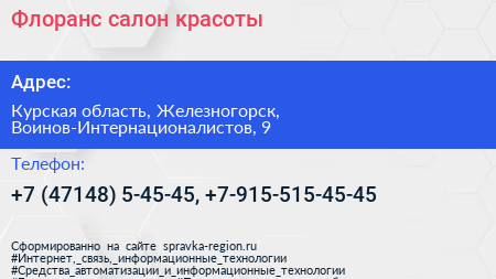 Флоранс, салон красоты по адресу Курская область, Железногорск, Воинов-Интернационалистов, 9 в дальнейшем Организация, размещена в следующих категориях: