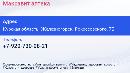 Максавит, аптека по адресу Курская область, Железногорск, Рокоссовского, 7Б в дальнейшем Организация, размещена в следующих категориях: