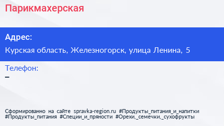 Парикмахерская по адресу Курская область, Железногорск, улица Ленина, 5 в дальнейшем Организация, размещена в следующих категориях: