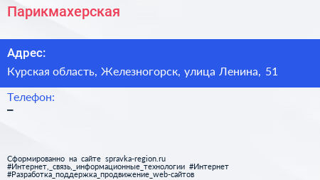 Парикмахерская по адресу Курская область, Железногорск, улица Ленина, 51 в дальнейшем Организация, размещена в следующих категориях: