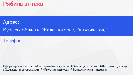 Рябина, аптека по адресу Курская область, Железногорск, Энтузиастов, 1 в дальнейшем Организация, размещена в следующих категориях: