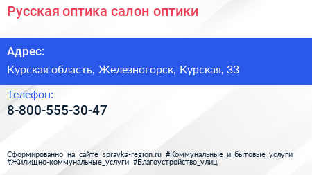 Русская оптика, салон оптики по адресу Курская область, Железногорск, Курская, 33 в дальнейшем Организация, размещена в следующих категориях: