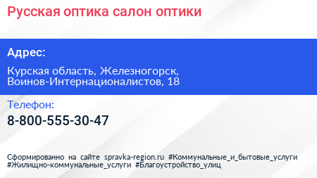 Русская оптика, салон оптики по адресу Курская область, Железногорск, Воинов-Интернационалистов, 18 в дальнейшем Организация, размещена в следующих категориях: