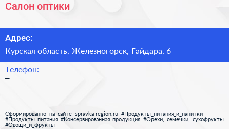 Салон оптики по адресу Курская область, Железногорск, Гайдара, 6 в дальнейшем Организация, размещена в следующих категориях:
