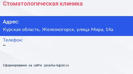Стоматологическая клиника по адресу Курская область, Железногорск, улица Мира, 14а в дальнейшем Организация, размещена в следующих категориях:
