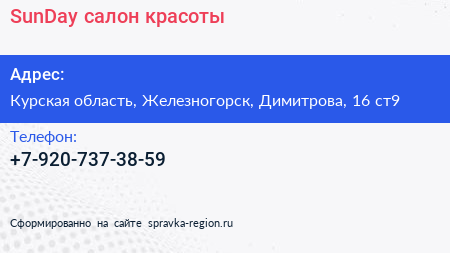 SunDay, салон красоты по адресу Курская область, Железногорск, Димитрова, 16 ст9 в дальнейшем Организация, размещена в следующих категориях: