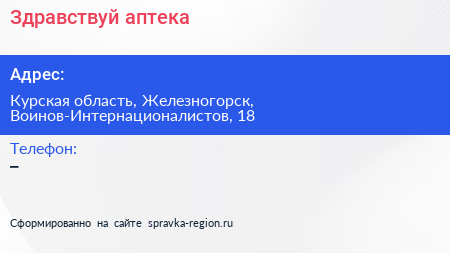 Здравствуй!, аптека по адресу Курская область, Железногорск, Воинов-Интернационалистов, 18 в дальнейшем Организация, размещена в следующих категориях:
