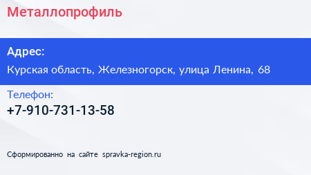 Металлопрофиль по адресу Курская область, Железногорск, улица Ленина, 68 в дальнейшем Организация, размещена в следующих категориях: