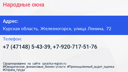 Народные окна по адресу Курская область, Железногорск, улица Ленина, 72 в дальнейшем Организация, размещена в следующих категориях: