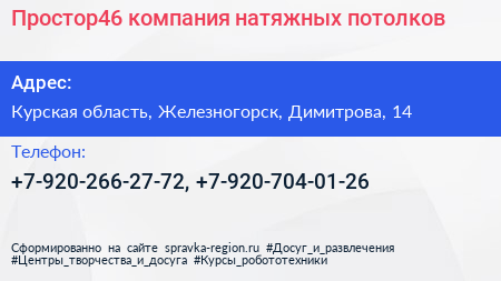 Простор46, компания натяжных потолков по адресу Курская область, Железногорск, Димитрова, 14 в дальнейшем Организация, размещена в следующих категориях: