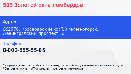 585*Золотой, сеть ломбардов по адресу 662978, Красноярский край, Железногорск, Ленинградский проспект, 55 в дальнейшем Организация, размещена в следующих категориях: