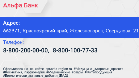 Альфа-Банк по адресу 662971, Красноярский край, Железногорск, Свердлова, 21 в дальнейшем Организация, размещена в следующих категориях: