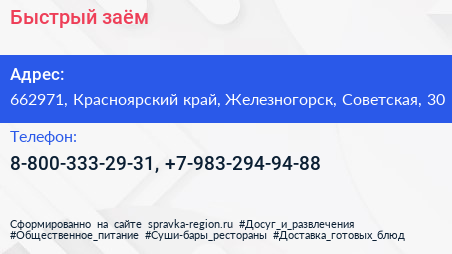 Быстрый заём по адресу 662971, Красноярский край, Железногорск, Советская, 30 в дальнейшем Организация, размещена в следующих категориях: