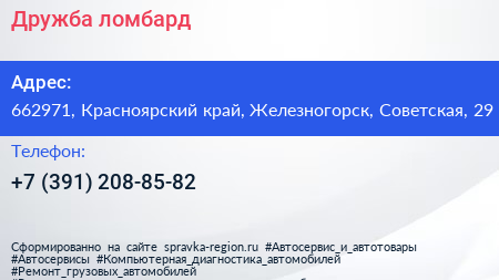 Дружба, ломбард по адресу 662971, Красноярский край, Железногорск, Советская, 29 в дальнейшем Организация, размещена в следующих категориях: