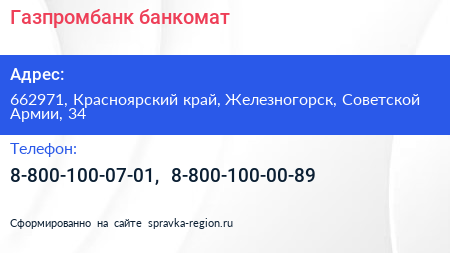 Газпромбанк, банкомат по адресу 662971, Красноярский край, Железногорск, Советской Армии, 34 в дальнейшем Организация, размещена в следующих категориях: