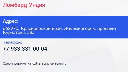 Ломбард Унция по адресу 662970, Красноярский край, Железногорск, проспект Курчатова, 58а в дальнейшем Организация, размещена в следующих категориях: