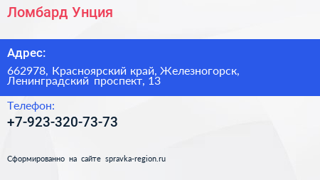 Ломбард Унция по адресу 662978, Красноярский край, Железногорск, Ленинградский проспект, 13 в дальнейшем Организация, размещена в следующих категориях: