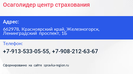 Осаголидер, центр страхования по адресу 662978, Красноярский край, Железногорск, Ленинградский проспект, 1Б в дальнейшем Организация, размещена в следующих категориях: