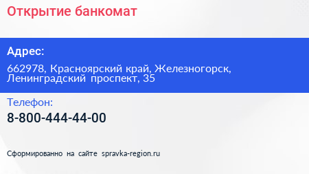 Открытие, банкомат по адресу 662978, Красноярский край, Железногорск, Ленинградский проспект, 35 в дальнейшем Организация, размещена в следующих категориях: