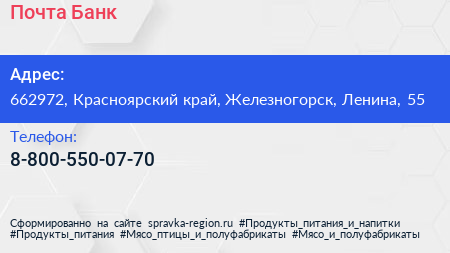 Почта Банк по адресу 662972, Красноярский край, Железногорск, Ленина, 55 в дальнейшем Организация, размещена в следующих категориях: