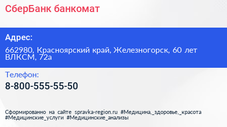 СберБанк, банкомат по адресу 662980, Красноярский край, Железногорск, 60 лет ВЛКСМ, 72а в дальнейшем Организация, размещена в следующих категориях: