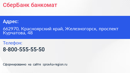 СберБанк, банкомат по адресу 662970, Красноярский край, Железногорск, проспект Курчатова, 48 в дальнейшем Организация, размещена в следующих категориях: