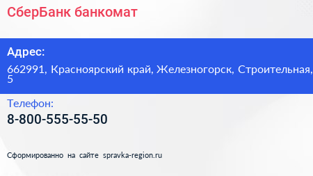 СберБанк, банкомат по адресу 662991, Красноярский край, Железногорск, Строительная, 5 в дальнейшем Организация, размещена в следующих категориях: