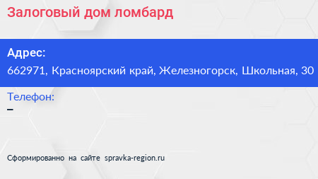 Залоговый дом, ломбард по адресу 662971, Красноярский край, Железногорск, Школьная, 30 в дальнейшем Организация, размещена в следующих категориях: