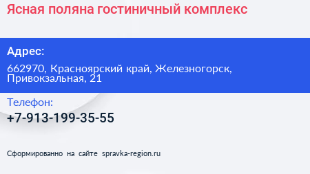 Ясная поляна, гостиничный комплекс по адресу 662970, Красноярский край, Железногорск, Привокзальная, 21 в дальнейшем Организация, размещена в следующих категориях:
