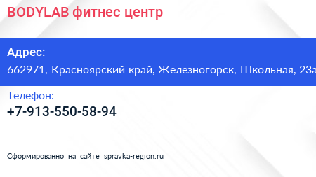 BODYLAB, фитнес-центр по адресу 662971, Красноярский край, Железногорск, Школьная, 23а в дальнейшем Организация, размещена в следующих категориях: