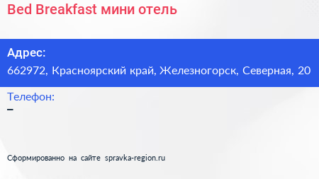 Bed & Breakfast, мини-отель по адресу 662972, Красноярский край, Железногорск, Северная, 20 в дальнейшем Организация, размещена в следующих категориях: