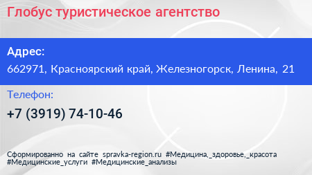Глобус, туристическое агентство по адресу 662971, Красноярский край, Железногорск, Ленина, 21 в дальнейшем Организация, размещена в следующих категориях: