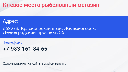 Клёвое место, рыболовный магазин по адресу 662978, Красноярский край, Железногорск, Ленинградский проспект, 35 в дальнейшем Организация, размещена в следующих категориях: