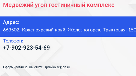 Медвежий угол, гостиничный комплекс по адресу 663502, Красноярский край, Железногорск, Трактовая, 150 в дальнейшем Организация, размещена в следующих категориях: