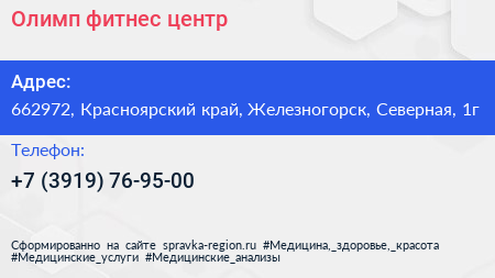 Олимп, фитнес-центр по адресу 662972, Красноярский край, Железногорск, Северная, 1г в дальнейшем Организация, размещена в следующих категориях: