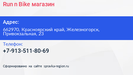 Run-n-Bike, магазин по адресу 662970, Красноярский край, Железногорск, Привокзальная, 23 в дальнейшем Организация, размещена в следующих категориях: