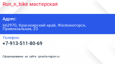 Run_n_bike, мастерская по адресу 662970, Красноярский край, Железногорск, Привокзальная, 23 в дальнейшем Организация, размещена в следующих категориях: