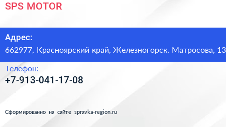 SPS-MOTOR по адресу 662977, Красноярский край, Железногорск, Матросова, 13 в дальнейшем Организация, размещена в следующих категориях: