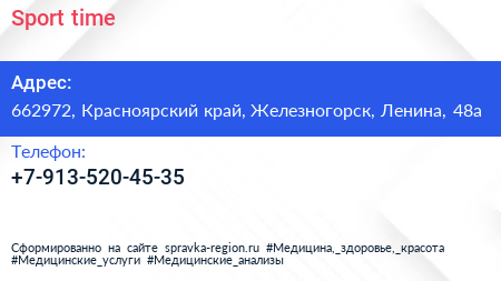 Sport time по адресу 662972, Красноярский край, Железногорск, Ленина, 48а в дальнейшем Организация, размещена в следующих категориях: