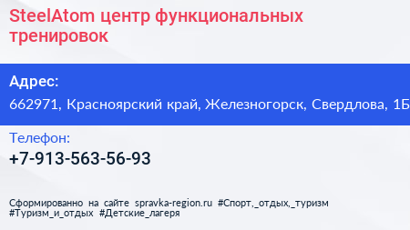 SteelAtom, центр функциональных тренировок по адресу 662971, Красноярский край, Железногорск, Свердлова, 1Б в дальнейшем Организация, размещена в следующих категориях: