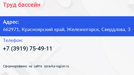Труд, бассейн по адресу 662971, Красноярский край, Железногорск, Свердлова, 3 в дальнейшем Организация, размещена в следующих категориях: