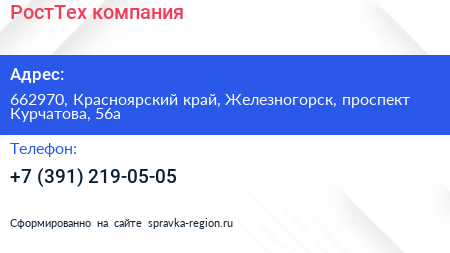 РостТех, компания по адресу 662970, Красноярский край, Железногорск, проспект Курчатова, 56а в дальнейшем Организация, размещена в следующих категориях: