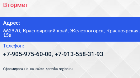 Втормет по адресу 662970, Красноярский край, Железногорск, Красноярская, 15в в дальнейшем Организация, размещена в следующих категориях:
