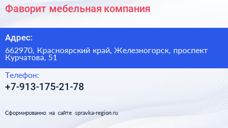 Фаворит, мебельная компания по адресу 662970, Красноярский край, Железногорск, проспект Курчатова, 51 в дальнейшем Организация, размещена в следующих категориях: